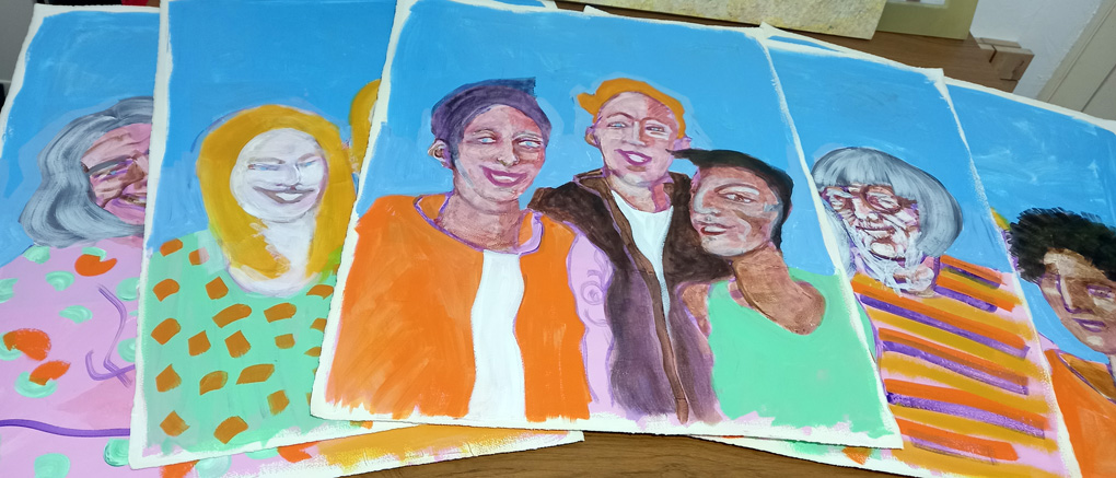 I’ve been working on and off with these 5 paintings for a few weeks and I’ve hit a brick wall with them! I deliberately set out to work from my imagination rather than from life, which is what I normally do. But I’m stuck – where to go with them now? Should I go representational? Should I go Expressionist? Fauvist? Pop Art? I’ll just have to get the paint out and push beyond this creative block.