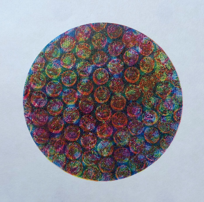 I spent a bit more time playing with a gel plate at Swansea Print Workshop this afternoon, using a round gel plate, a few pieces of used bubble wrap, Cranfield Safe-Wash Process Cyan relief ink and Extender onto HoSho paper. I overprinted the pieces I’ve done in the last two weeks, mixing very little of the blue pigment into the Extender, to give the red and yellow underneath a chance to shine through. The translucency of the colours allows the colours to mix, so there’s a range of secondary as well as primary colours.