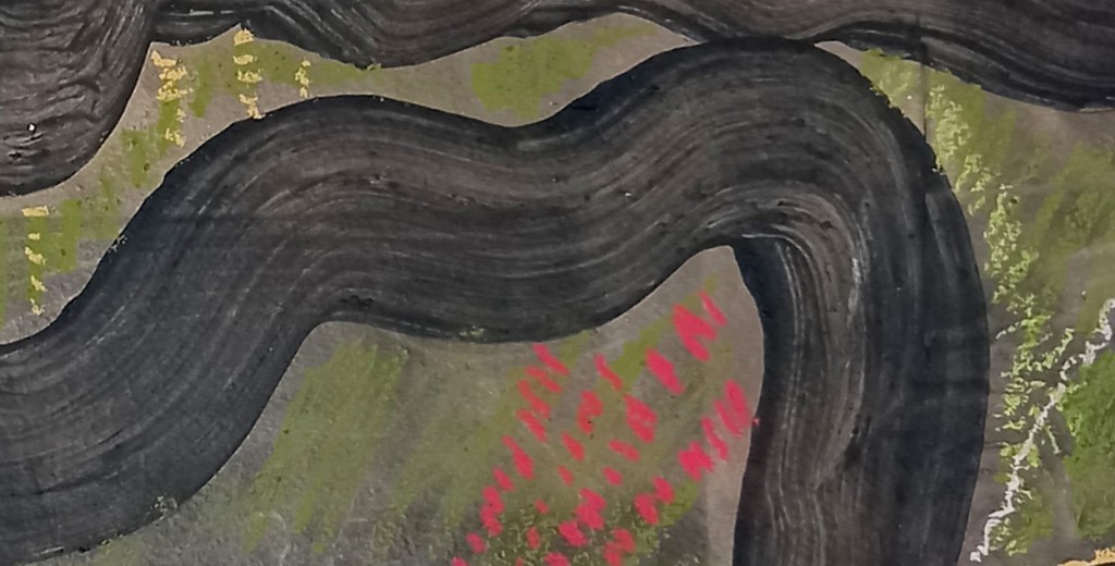 I’ve been trying to push out of my comfort zone so I used this sheet up the mountain, at the lake. It’s so weird that I couldn’t even begin to do anything representational. The black swirls dominate so I just sat on the grass and got into the atmosphere of the place and let it guide my choice of colours and what I did with them. Maybe a bit like the Surrealists used to do.