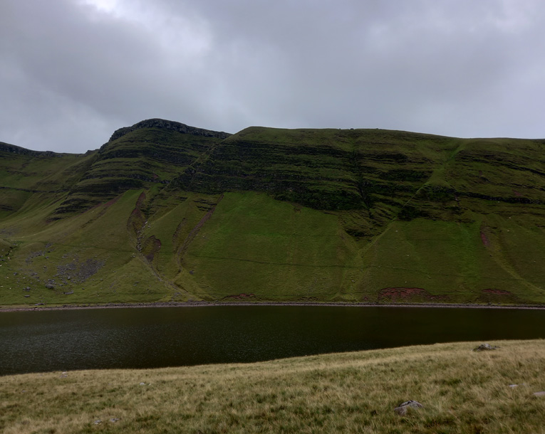 Husb and I took a walk up the mountain Llyn y Fan on the Bank Holiday to visit the smaller of the mountain lakes, Llyn y Fan Fach. I took some sheets of Somerset paper that I’d prepared in advance. This sheet was primed with white acrylic gesso, than brushed roughly with my home made walnut husk ink and finally I painted on the swirls with Bideford Black mixed with Nori paste (read about the process here).