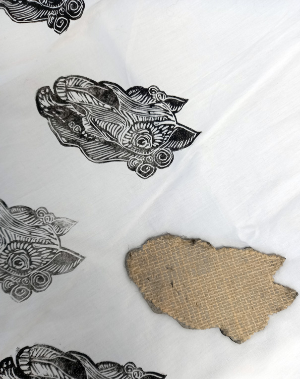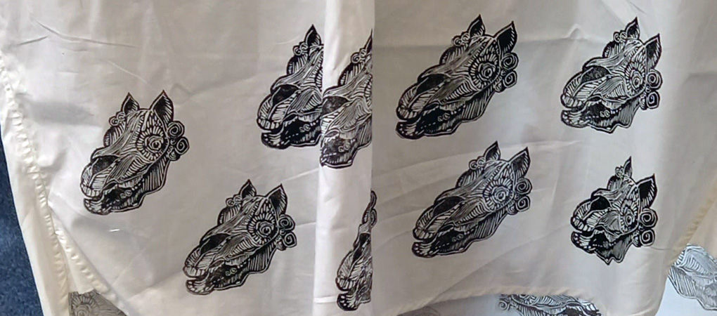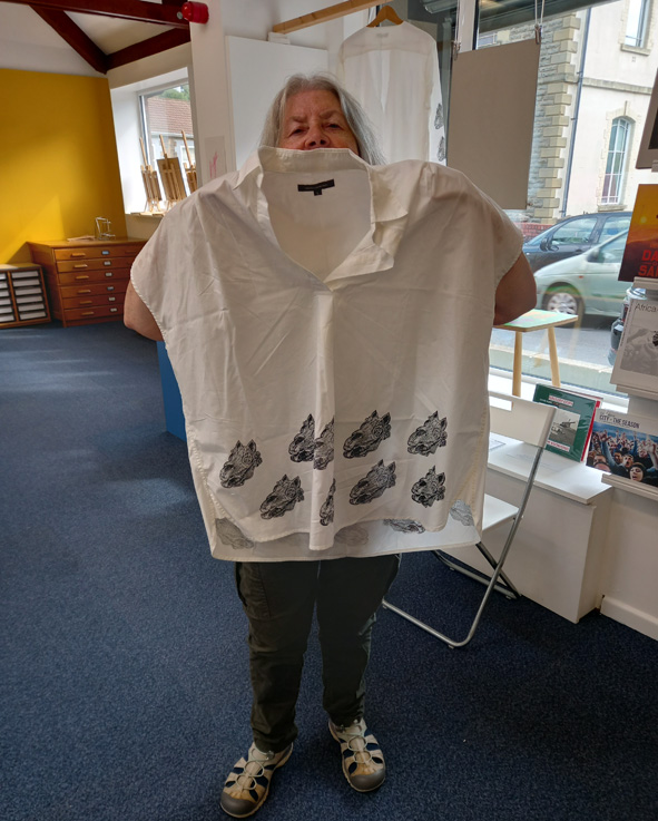 I did my one-day artist residency at The Workers Gallery in Ynyshir today and had a great time, some really fascinating people came into the gallery and first off, I used my Mari Lwyd lino block to print up a cotton shirt, a cheap buy from TK Maxx, with Speedball Fabric Block Printing Ink.