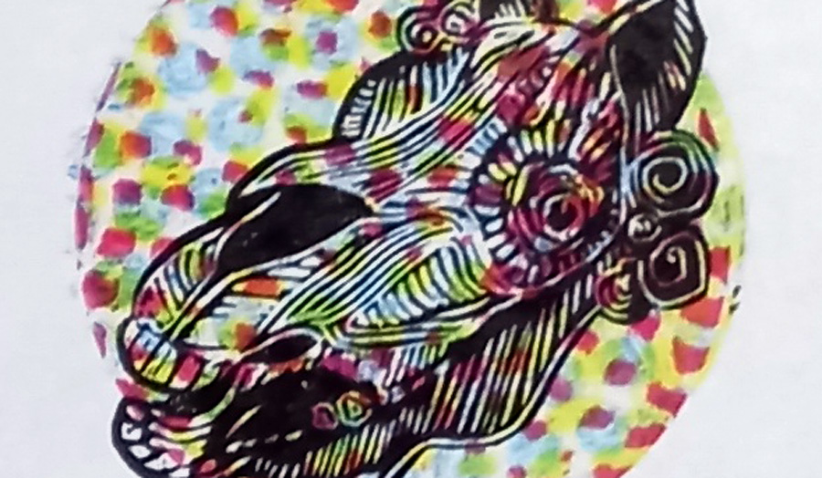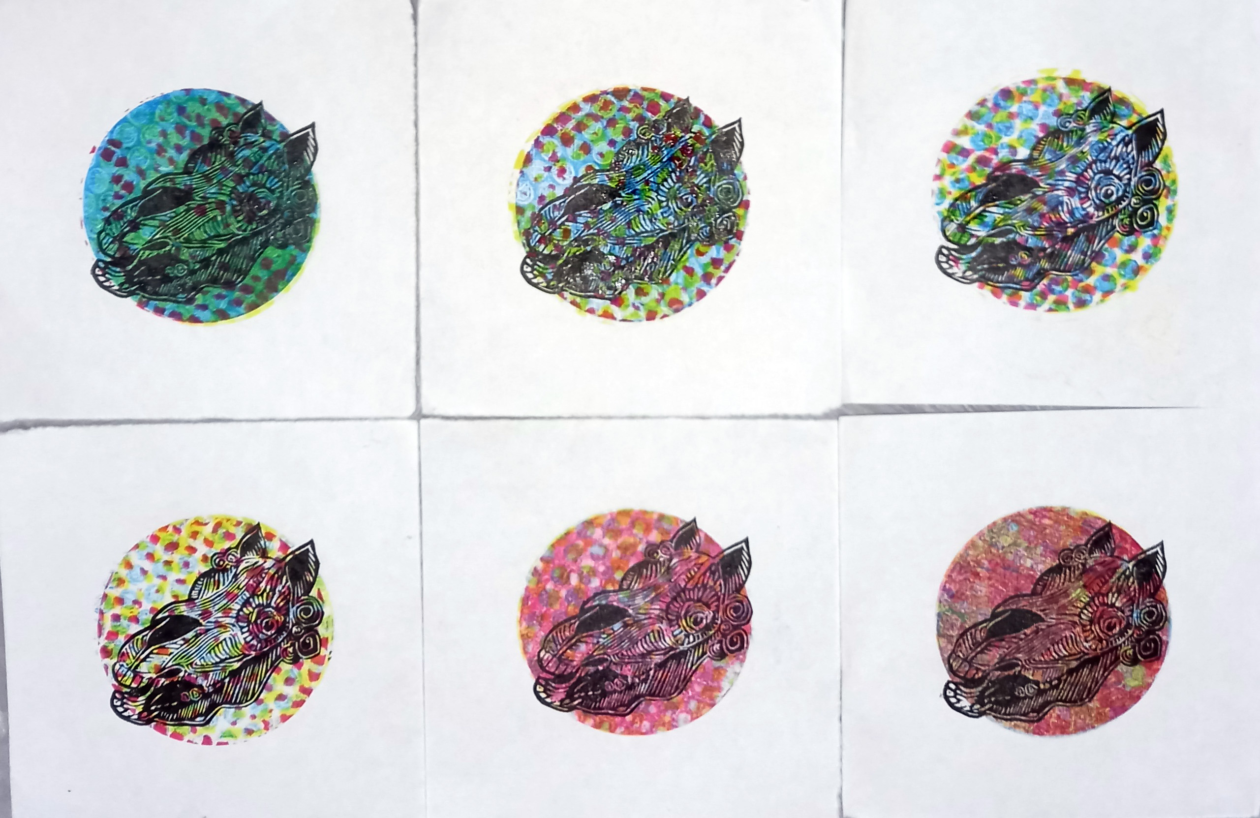 I spent a day up The Workers Gallery in Ynyshir yesterday and took a small lino block of a Mari Lwyd I cut a couple of years ago. I thought I’d try doing different things with it. I printed a border on a cheap cotton shirt (here) and then I switched inks and printed Mari’s head over some little Gel Plate monotypes I did a few weeks back (here). I really like the result. They’re psychedelic Maris!