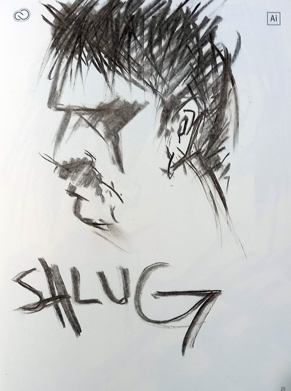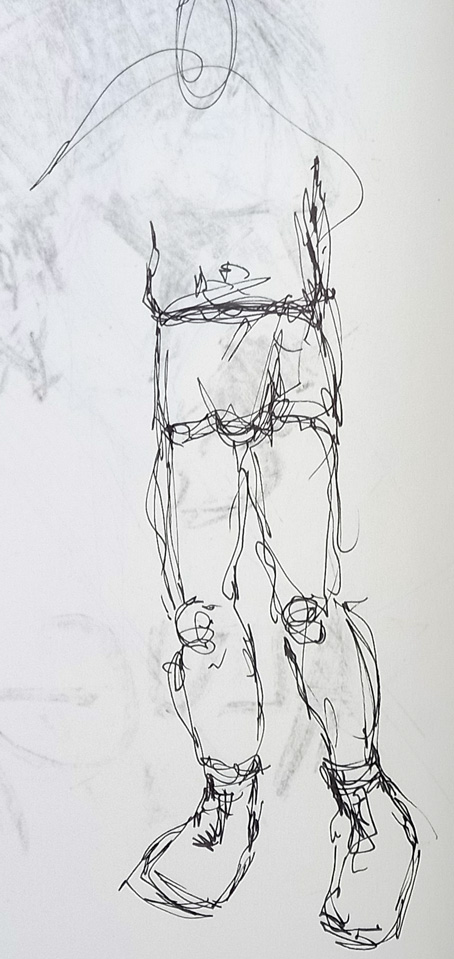 I did the portrait sketch with Nitram charcoal and the scribbled pants with a Faber Castell Pitt drawing pen.