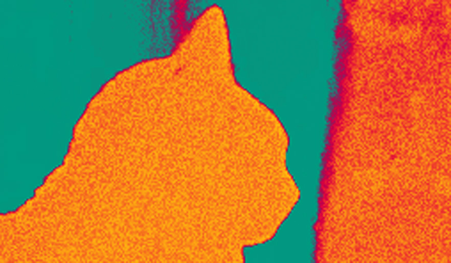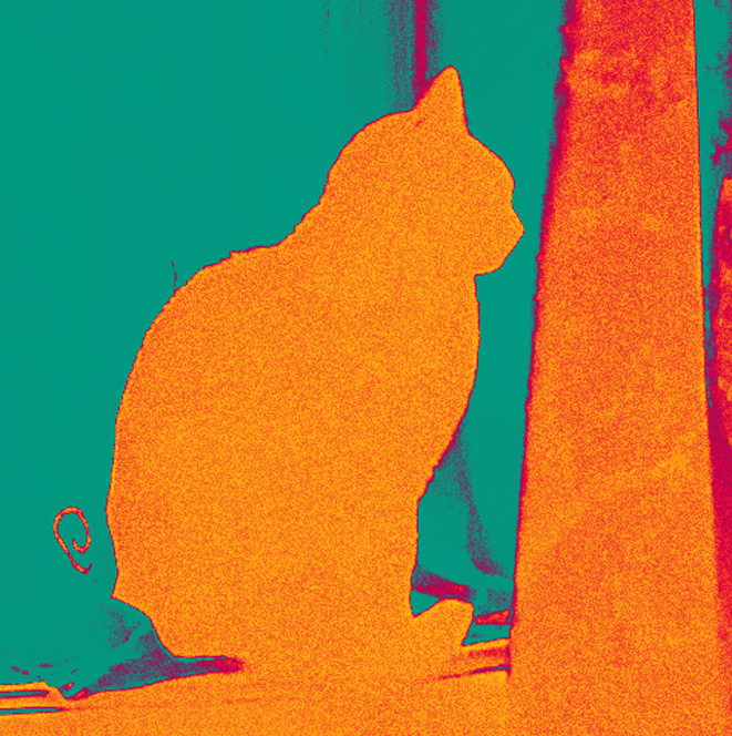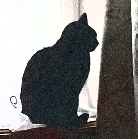 I took a few photos of our new rescue kitty, William ChatNoir, or Bill for short, on our window seat, backlit against the spiral net curtain. She’s a black cat and the photos are perfect silhouettes in black and white, and I fancied playing with some of them in Adobe Photoshop.