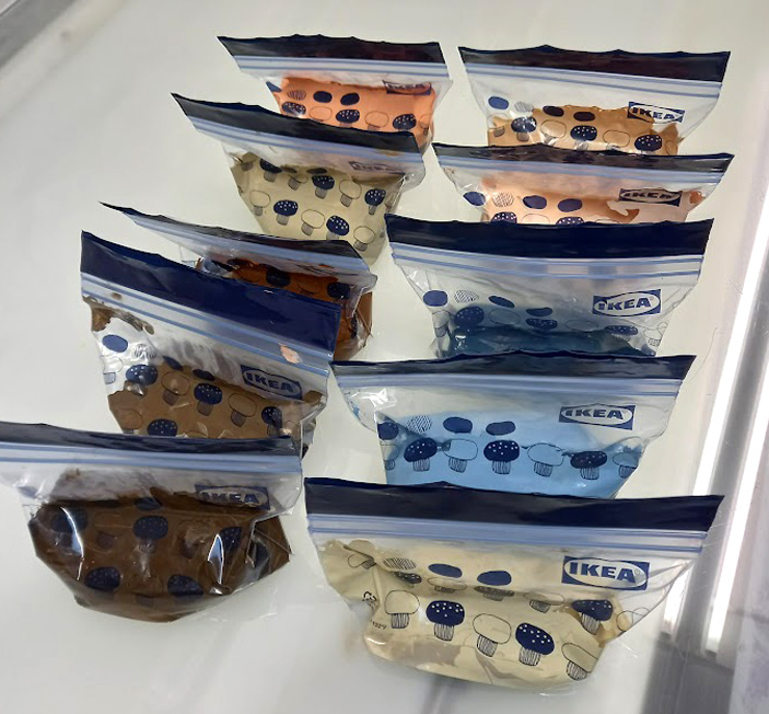 There’s no glamour in being an artist, there’s loads of messiness and cleaning up. It’s also expensive and it’s important to reuse and recycle as many materials as possible. There’s always a lot of screenprint inks left over after courses at Swansea Print Workshop and if they’re stored properly they can be usable for months. It’s a bit of a problem finding the right storage system though. Glass jars are not very safe in a workshop setting and plastic polypockets can get messy. So today I tried out some small (10 oz) IKEA foodbags and they worked a treat. They look quite cute too.