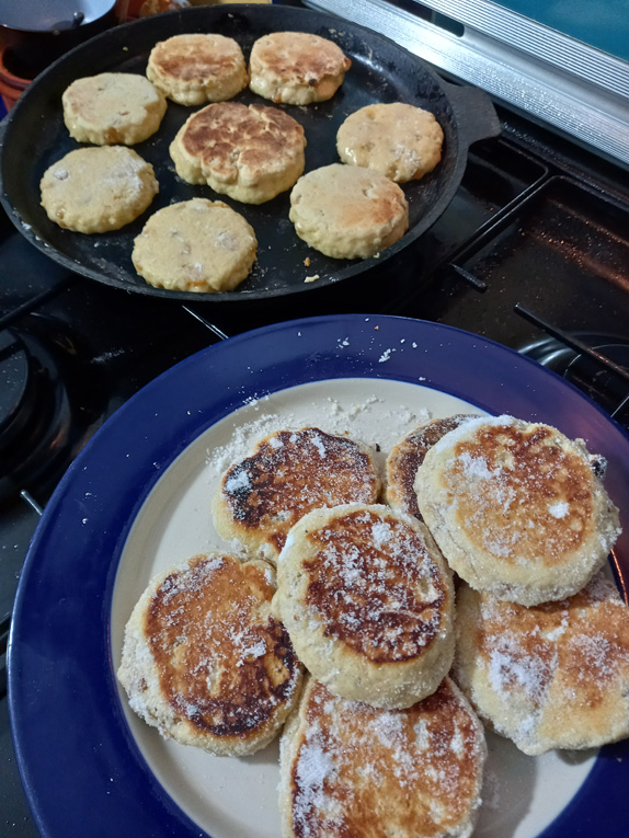 I also made some Welsh Cakes. They’re called “pice ar y maen” in the Welsh language, which translates as “little cakes on the stone” – the griddle is also often called a bake-stone in English. I’m scoffing one now, still warm and fragrant with vanilla and nutmeg, loaded with juicy golden sultanas.