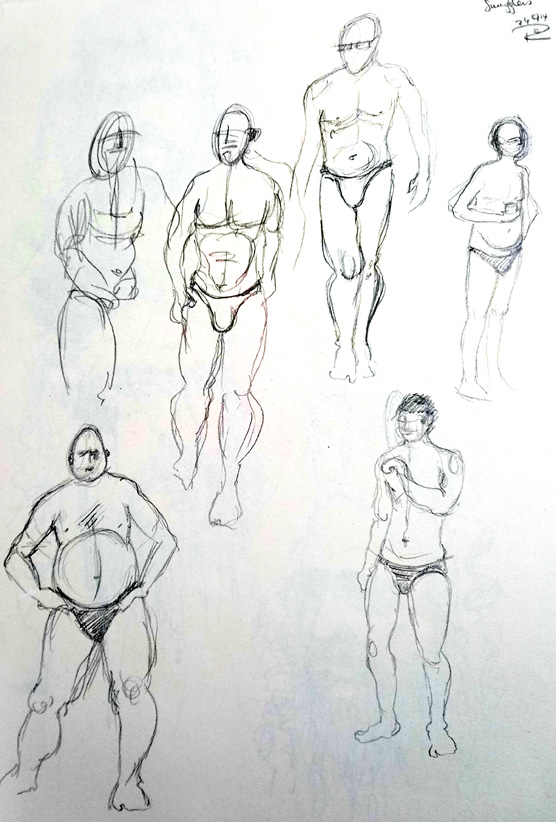 I’m decluttering, sorting and storing loads of old work and I’ve been skimming through some old sketchbooks, loads of things I’ve forgotten. Here’s a page of sketches from the beach probably, about 9 years ago. There’s a good range of male body types here – the bellies are fun to draw but it’s surprising how many men were still wearing “Speedos”, or budgie smugglers as we call them round here.