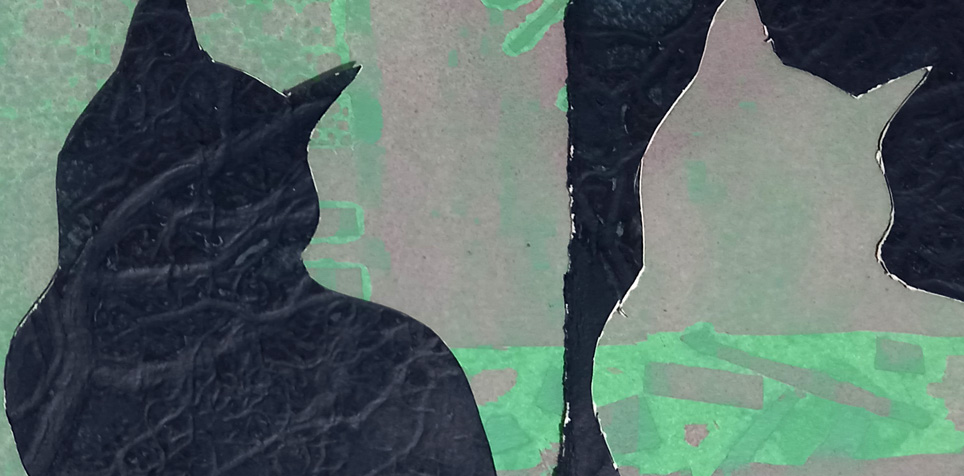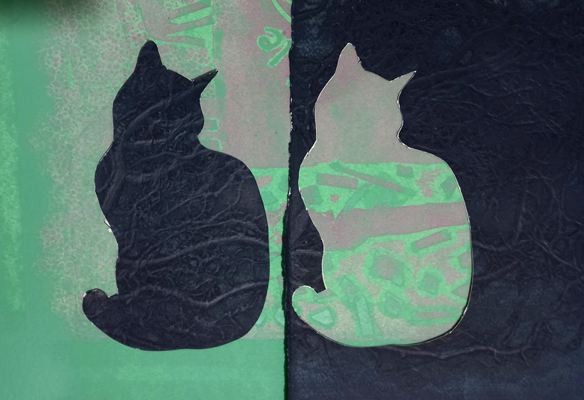 I traced a drawing I did recently of Bill, our new rescue cat, and used it as a template to cut some cat shapes to have a play with. I recently recycled some textured papers, old prints that had been rejected. I squeegeed some acrylic inks across their surfaces to see what happened.