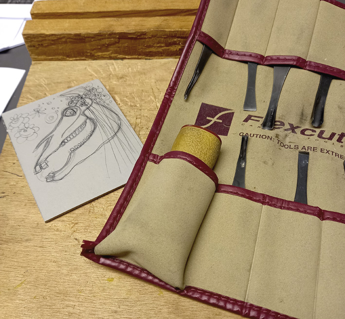 It’s that time of year to start the annual Mari Lwyd lino cut, for my New Year greetings cards. I’m cutting two blocks this year, because I’m also running some lino-cutting sessions at the 9-to-90 Creative Community over the next few weeks, using the Mari Lwyd as our theme and I want to demonstrate the 2 different ways of cutting lino.