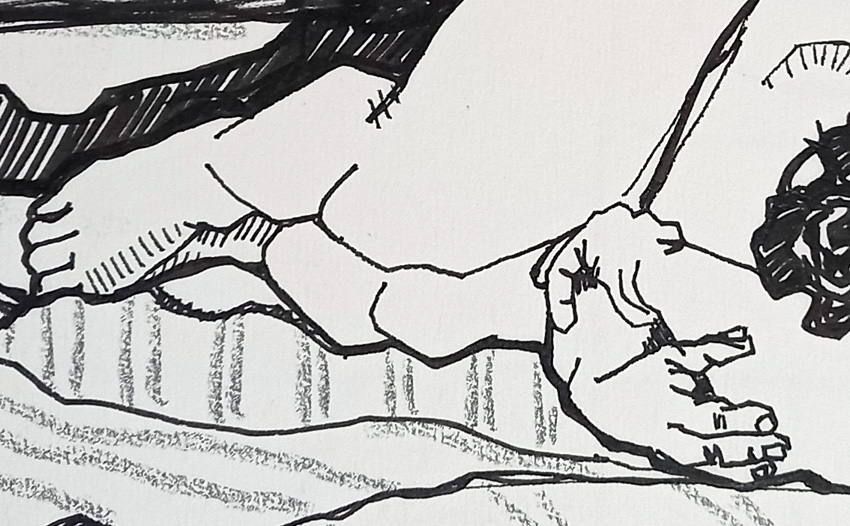 I’ve been going through my art cupboards and drawers sorting out tools, materials, storing old work properly, boring but necessary. I found this old life drawing that had lost its sketchbook (size A3). I used to draw like this all the time, using Faber Castell Pitt drawing pens, enhanced with graphite blocks. I guess this could be about 15 years ago.