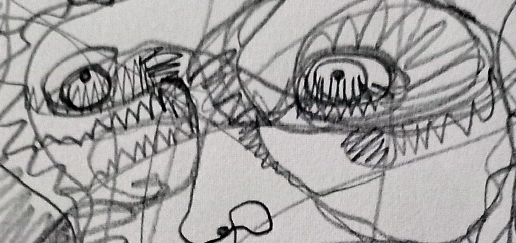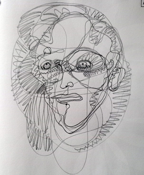 In this exercise I placed 4 dots onto the paper, roughly in the position of two eyes, tip of the nose and mouth. Next I scribbled randomly across the paper without taking the pencil off it. Then I started emphasising and filling in areas to represent the features of a face, using the lines that are there, not making new ones. I like doing this, it looks like something that could be developed into machine embroidery.