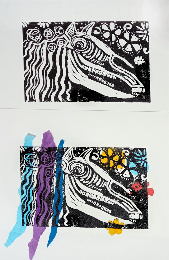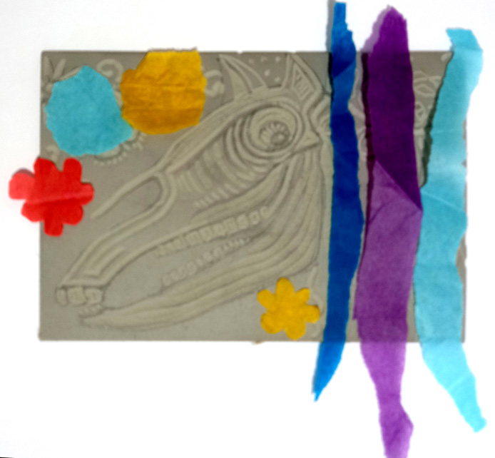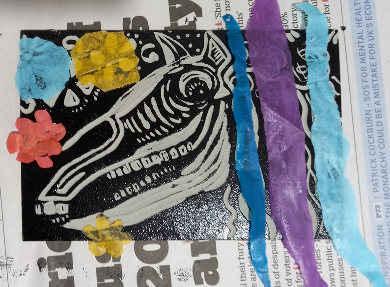 I printed up a first proof from my latest Mari Lwyd lino block and then did a second proof with chine collé, using fine coloured tissue papers. I cut and ripped some tissue paper shapes than placed them on the un-inked block, just to see if they were what I wanted and where I was going to put them. Then I inked the block (Cranfield Safe Wash relief ink).