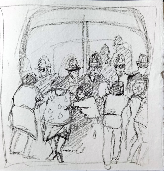 I started by Googling Miners Wives UK images and selected about a dozen that I thought had an interesting composition. These are for practice, to get familiar with the subject and to start the process of observation. One thing that strikes me about this one is how much bigger than the women the police are. I know men are generally bigger, but this image really brings it home to me. The women are little dwts. This is sketched in graphite into a Khadi sketchbook.