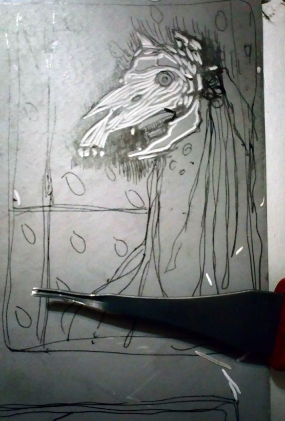 We’re at that time of year when the old Welsh tradition of The Mari Lwyd / Y Fari Lwyd, is awakening from her slumbers ready for her night, Hen Galan, a month away early in the New Year. I’m going to post my archive Mari Lwyds throughout December and early January to get us all in the mood. Here’s one from 5 years ago which eventually became a Christmas / New Year card. Sometimes they look quite funny but this one seems sinister to me.