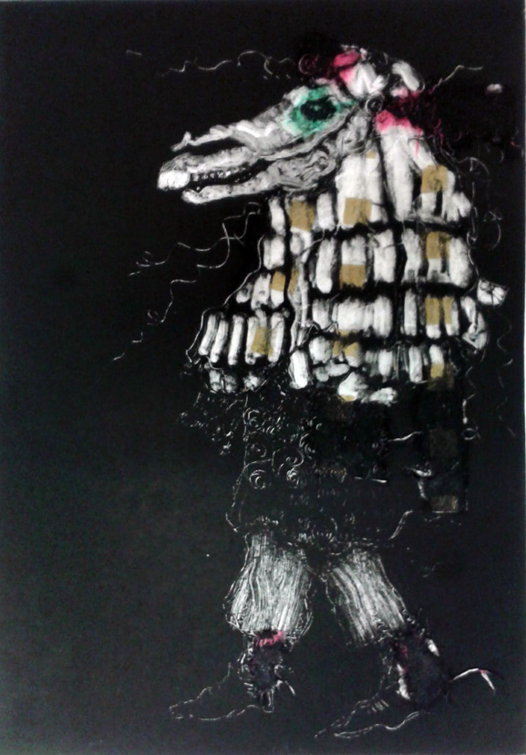 Here’s a monotype Mari Lwyd from my archives. I’m posting them through December and early January up to her night, Hen Galan on January 13th. I did this very early in 2017 and it was based on a “live” sketch I did the previous month at an appearance by the Mari in Gellionen Chapel. I used chine collé to add colour and texture.