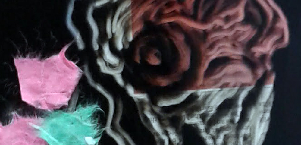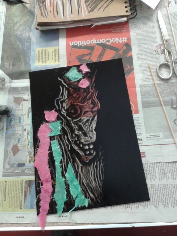 Here’s an unusual view of a Mari Monotype, it’s all set up before I took the print. I inked an acrylic sheet, did the drawing of the Mari Lwyd onto it with cotton buds and brushes, and then laid some pieces of mulberry paper onto the surface to act as chine collé. This is the last view of it before putting a piece of paper over it and putting it through a press to take the print.