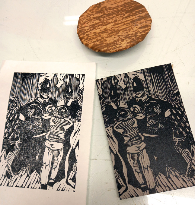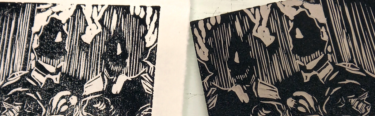I did this first proof from a small lino block that is an experimental detail of a much larger image I am working on for something that’s a secret just yet. I wanted to try out different marks, especially using some of the tools I hardly ever look at. I’m liking the direction this is taking.