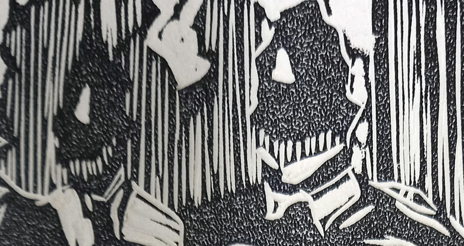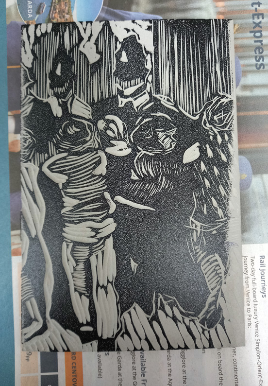 I love that moment when I roll the first layer of ink onto a new lino block, seeing the image appear out of the light grey surface. It always gives me a thrill. It’s never the same again because when you clean the block at the end of a session, the light grey bits get stained with the ink.