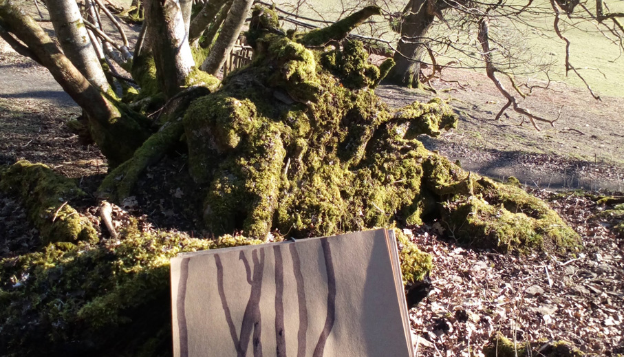 I’ve been rummaging through my digital folders and looking at old sketches. Here’s one from 2018, a sharp early Spring day in Dynefor Park near Llandeilo. A group of artists had travelled from the city to work in the arboretum there. I saw this lovely tree that had fallen over, but carried on growing, reaching upwards, battered and changed but still living.