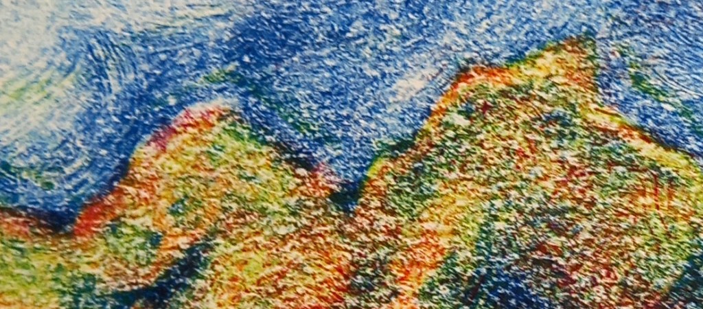 I spent a happy morning down at Swansea Print Workshop today, re-visiting a technique I used to do loads – it’s called the 3-Colour Reduction Monotype (or 3-Colour Stacking Monotype). I haven’t done this since before Covid19, over 4 years, maybe longer. Why does time shoot by so fast? I based this monotype on a very quick soft pastel sketch onto Khadi paper while I was travelling in Pakistan, a country of spectacular landscapes.