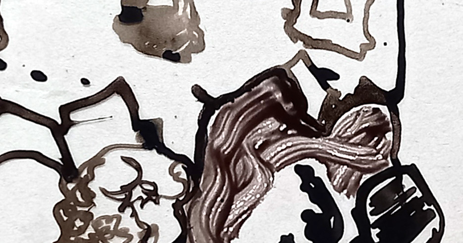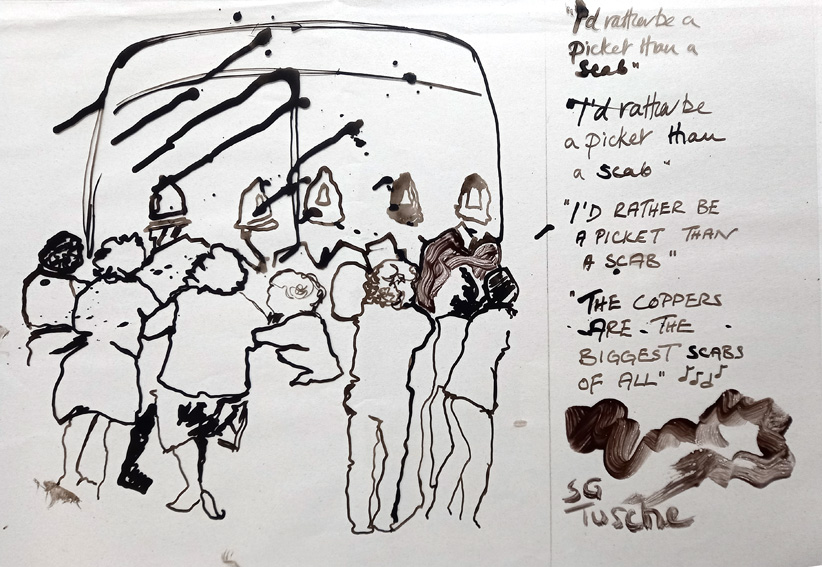 I spent a few hours down at Swansea Print Workshop this afternoon, trying out some more ideas for the print I intend to make about the glorious South Wales Miner’s Wives from the 1984-1985 strike. I have already made some pen and ink sketches from contemporary press photos and I’m trying out different materials to redraw this image onto Mark Resist film, a step in the photo-screenprint process. This first one is drawn with Indian ink and a script dip pen – it has a little blob on the point. I haven’t used one before and it’s fun. I tried some lettering too. I also used a little Soft-Ground Tusche (for lithography) applied with an Isabey squirrel-hair brush. It’s giving some interesting textures.