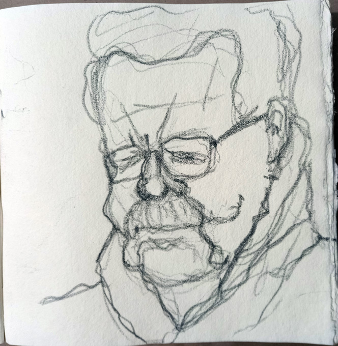 I was at the Riverside folk club the other evening and scribbled away in my sketch book. This performer was deeply focused, very wrapped up in performing. I used a 2B Koh-i-Noor graphite block into a square Khadi handmade paper sketchbook.
