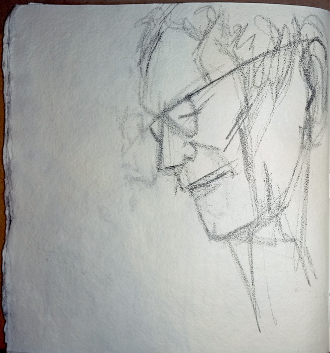 A quickly scribbled head with graphite into a Khadi sketchbook.