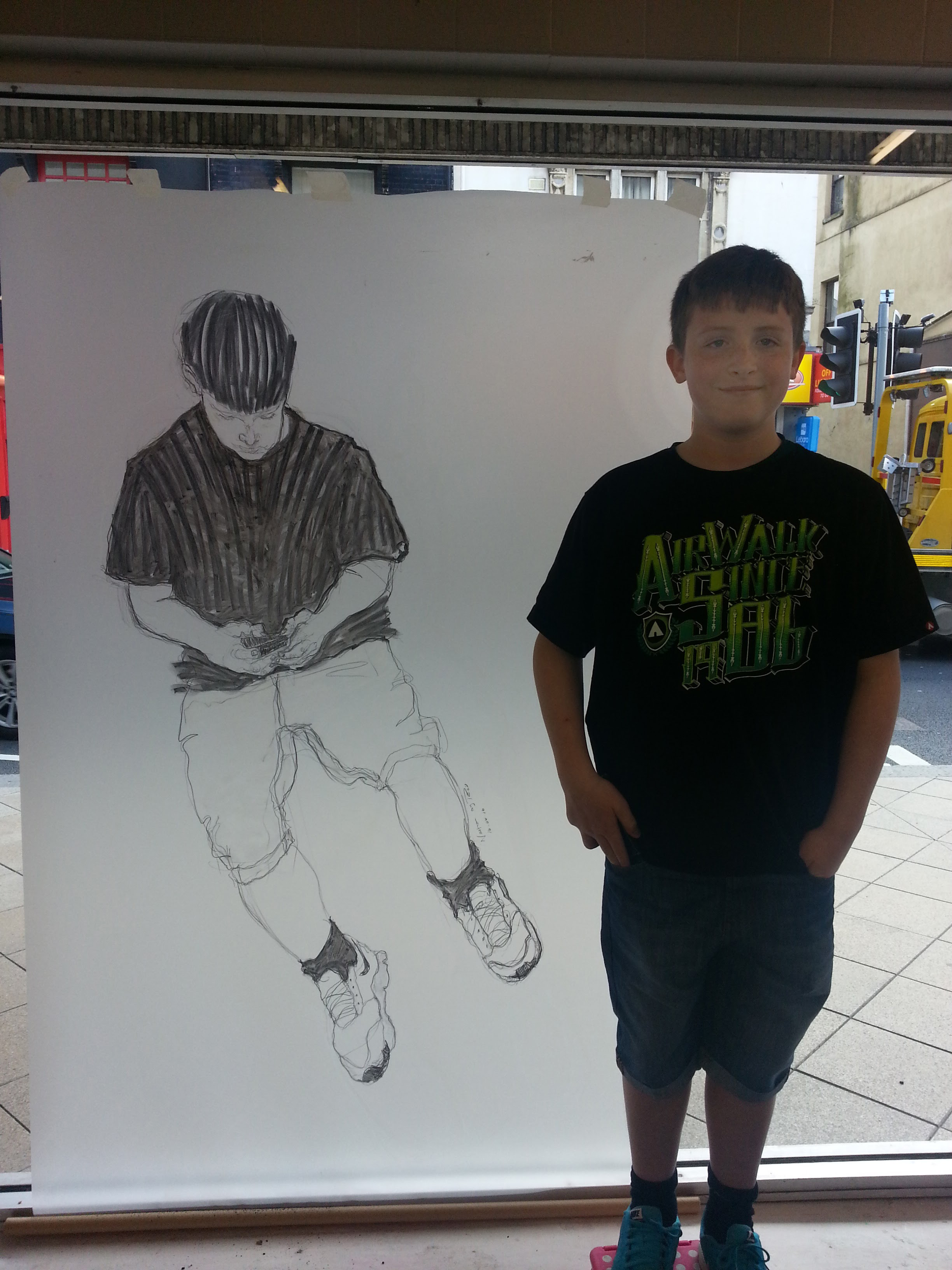 Here’s a very large, almost life size, drawing I did 8 years ago of my young great-nephew. I stuck a roll of drafting paper to the inside of a large window at the front of Volcano on Swansea’s High Street and perched my nephew on a stool with my Smartphone to keep him occupied while I drew him. Passers-by could see the drawing developing from the pavement.