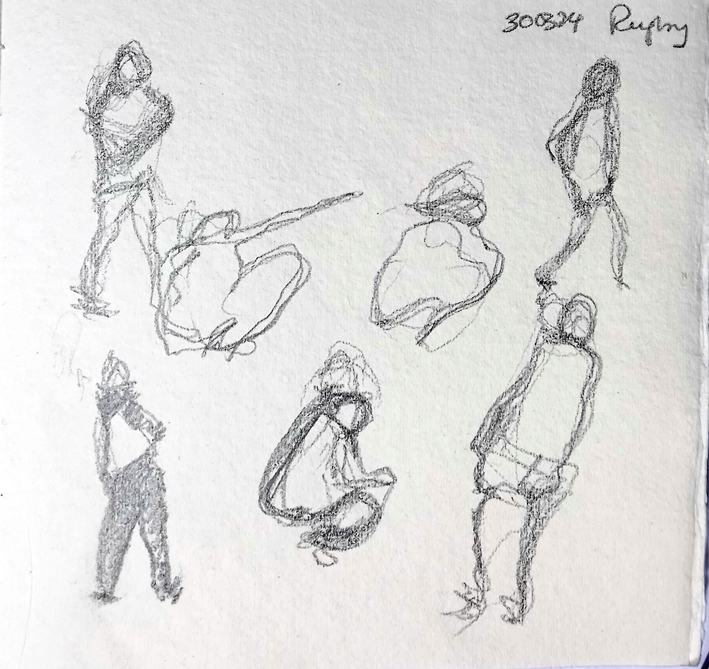 Here are a few more speedy scribbles I did at the rugby match on Saturday. It was nice there, I was invited to share a box, which was warm and dry so I could sketch in comfort. That’s the way to do it.
