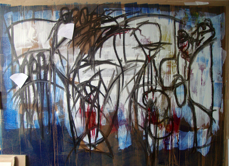 It was twelve years ago, in a Moment of Madness. I worked in oil bars onto a huge piece of cardboard stapled to the wall of my studio. I don’t know why I came over all Abstract Expressionist and I haven’t done it since. I didn’t really know where to go with it so it eventually ended up as mulch on my allotment.