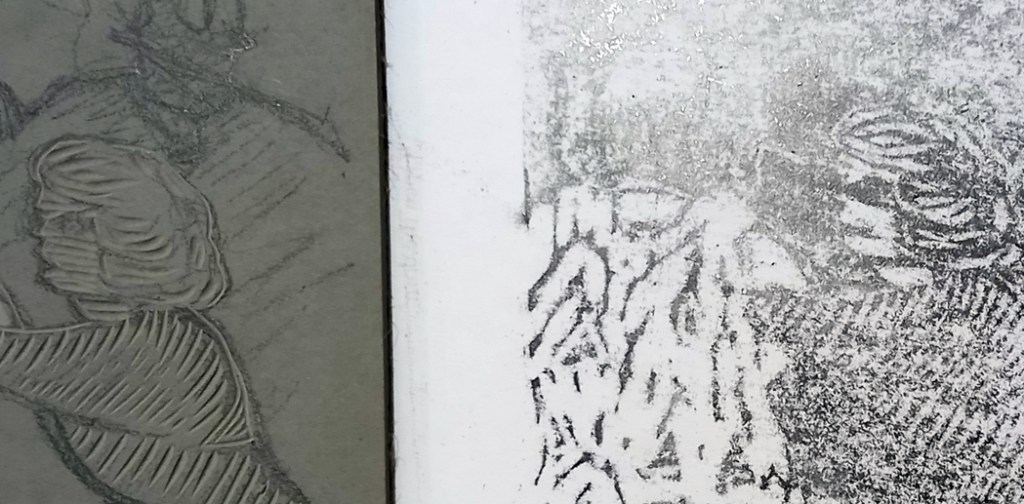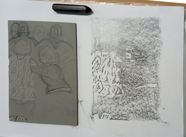 When I’m carving a lino block I like to check on it’s progress regularly. I do this by taking a rubbing with a piece of white paper and a block of graphite. Still a lot of cutting to do on this one though.