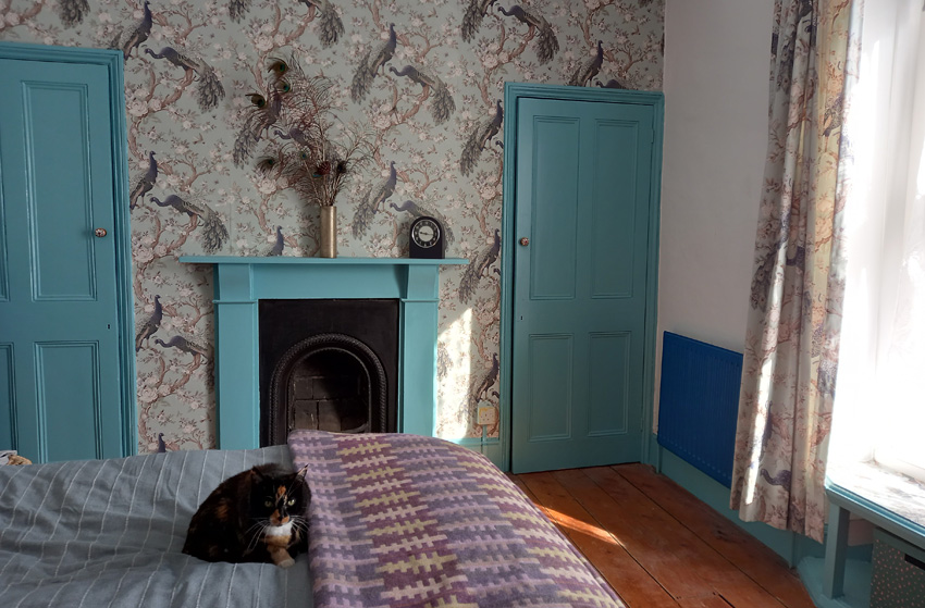In case you’re interested, the wallpaper is Laura Ashley and the blanket by Melin Tregwynt. And I got them both in a sale …. which makes me happy 😀 And the cat is Sparta Puss.