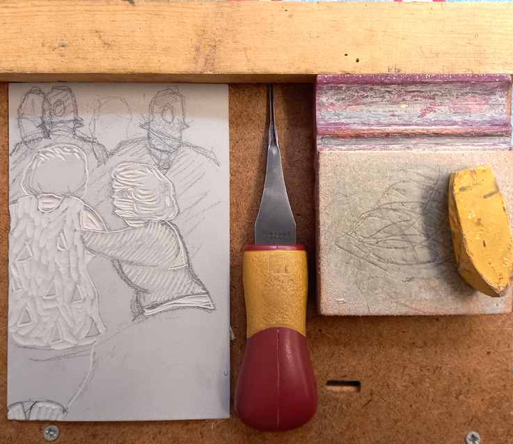 I did some more cutting into my little lino block this afternoon. I laid it out on the bench hook before I began, with my smallest Flexcut gouge, the Flexcut Strop and Flexcut Gold Polishing Compound.