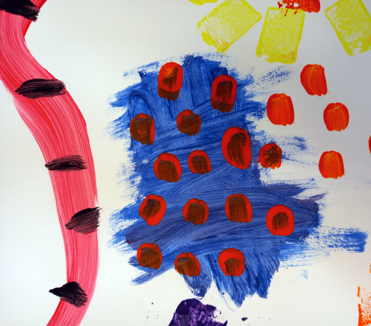 I loved getting my fingers stuck into poster paints the other day, and just having fun with them. I used a big brush as well. It’s nothing really, sploshing about, but still an opportunity to see how paints work and how colours work.