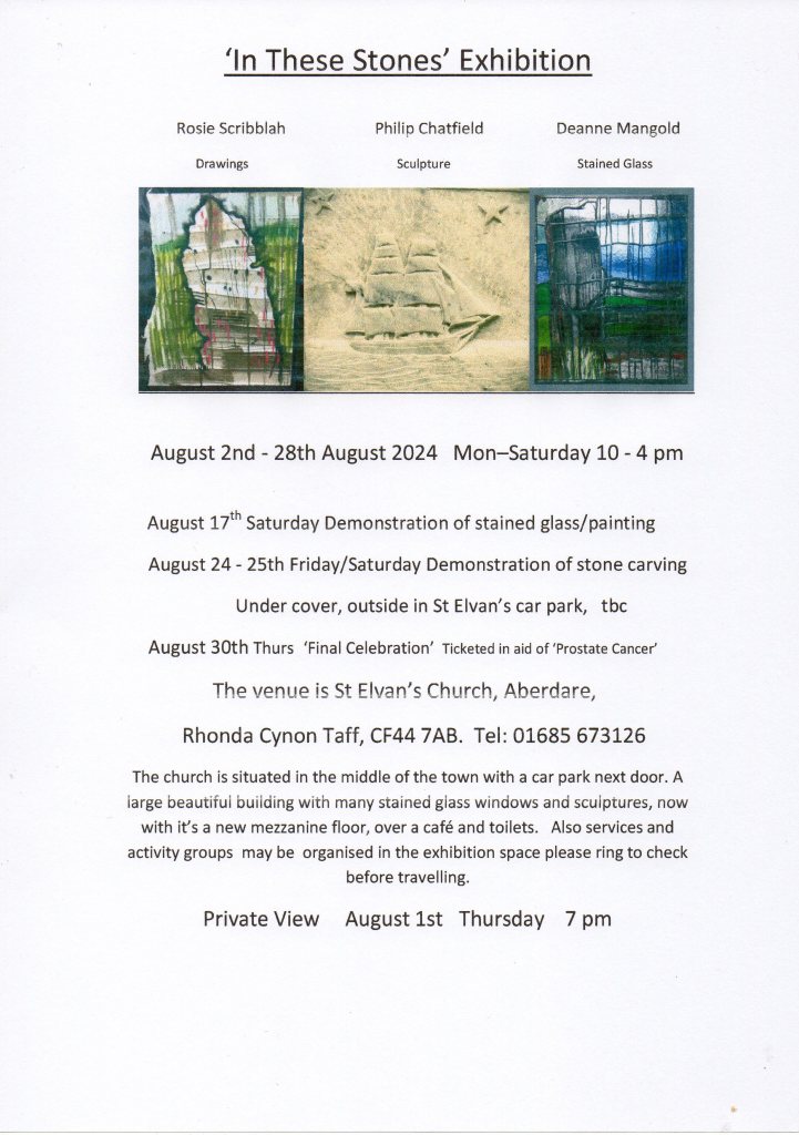 A few years back, I worked with pre-historian Dewi Bowen and filmmaker Melvyn Williams on a series of drawings/paintings of ancient standing stones in South Wales. Stained-glass artist Deanne Mangold saw them and wanted to make some glass panels based on my originals. So she did. And now there’s enough to exhibit. Deanne and I, joined by sculptor Philip Chatfield, are exhibiting our work at Saint Elvan’s in Aberdare throughout August, with a private view on August 1st at 7pm. Would be lovely to see you xxx