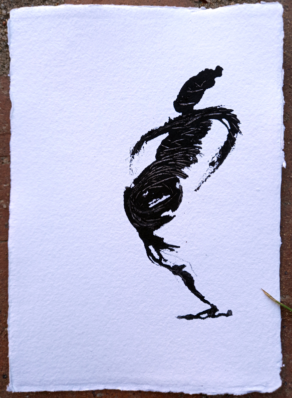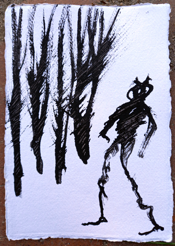 I took a set of 20 pieces of hand-made Khadi paper, size A5, to my artist residency in Germany earlier this month and after making over a hundred drawings on a very large piece of paper (see here) I switched from a big studio in a barn to a tiny ancient stable to work small. I had used 4 pieces of the Khadi paper before I came to the Atelierhof Werenzhaim, I decided to use the remaining 16 to draw from my imagination with twigs dipped in ink. I drew figures singly, mostly on their own but in one or two it seemed right to add something resembling a landscape, like the figure (above) on the left. Those marks might be trees, or stags, or …..