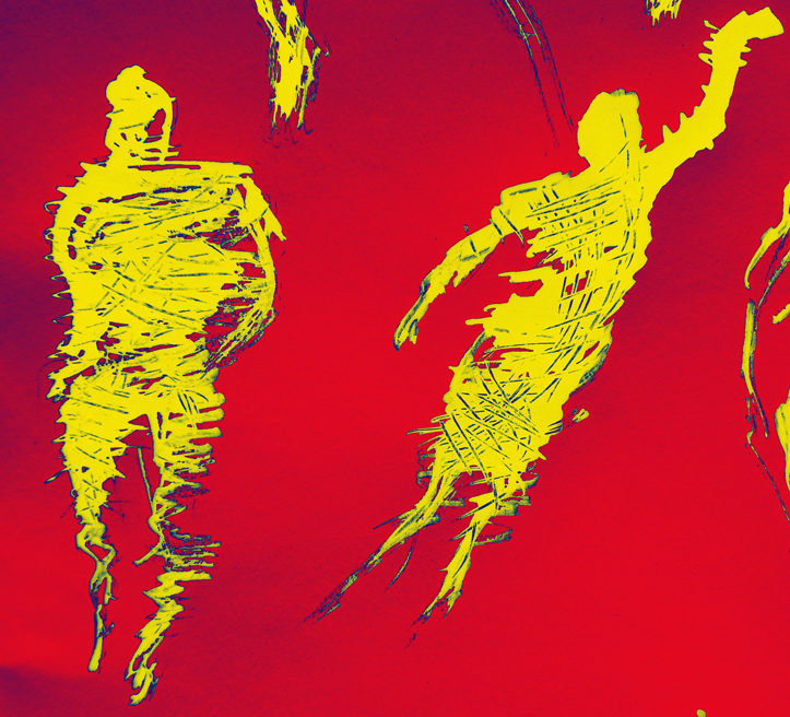 I don’t know how many little figures I drew on the big piece of paper during my recent residency in Germany, I haven’t counted them yet. They’re tucked away in a tube and I haven’t unwrapped them since I got home. Getting them home, now there’s a story! There’s probably more than a hundred and I’m enjoying picking out little groups, or pairs, to play with. I drew this couple originally in black ink with a twig, then I scratched into the wet ink with the narrow end of a bamboo pen to make the scribbly marks. In Adobe Photoshop, I cropped these 2 from a larger picture, inverted the image then pushed it into one of the colour combos in Gradient Map. I think they’ve gone from sombre to joyous.