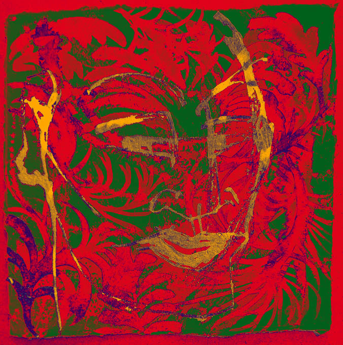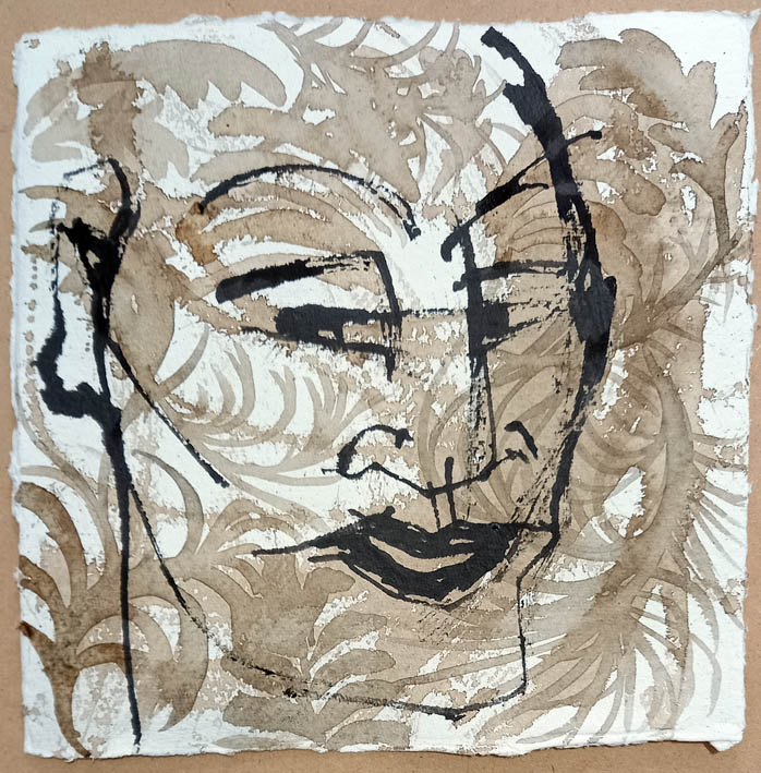 Another of the random heads I drew recently a few days ago, with some additional drawing layered over it with my home-made walnut ink (bottom right). Like the head I posted yesterday, I scanned and loaded it into Adobe Photoshop and tried out a couple of different Gradient Map options (left and top right). And there’s more pretty stuff going on.