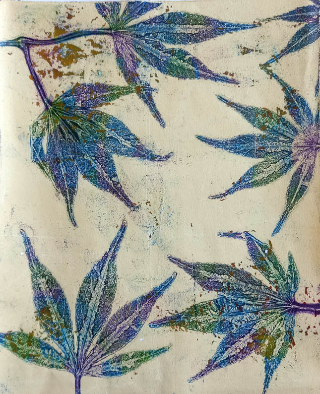 These leaves are so subtle and delicate, the detail is gorgeous. I’m using a Gelli Arts plate with Liquitex heavy body acrylic paints. I used Dioxazine Purple, Pthalocyanine Blue and Hookers Green for the leaves (first layer) and Unbleached Titanium for the background (second layer).