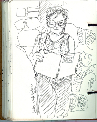 Faces from the past, sketchbook drawings from July 2012, about a year after I started this blog. Husb and family feature in a few, and people out and about in cafes, with a couple of old friends. We’re all older now.