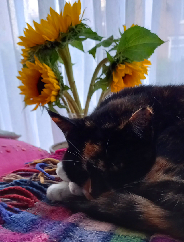It’s #Caturday Saturday once again, don’t the weeks rush by quickly? Here’s Sparta Puss all cwtched on a blankie on a giant cushion on the window seat, posing in front of some brilliant sunflowers.