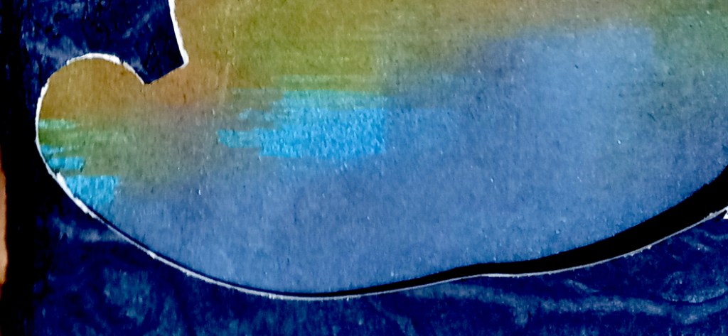 I also found a piece of cardboard that I had experimented on with acrylic paint, applied with a small foam roller. I put them together. I like it! I’ll try to find more things to put this cat-shaped hole on.