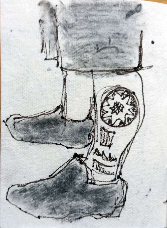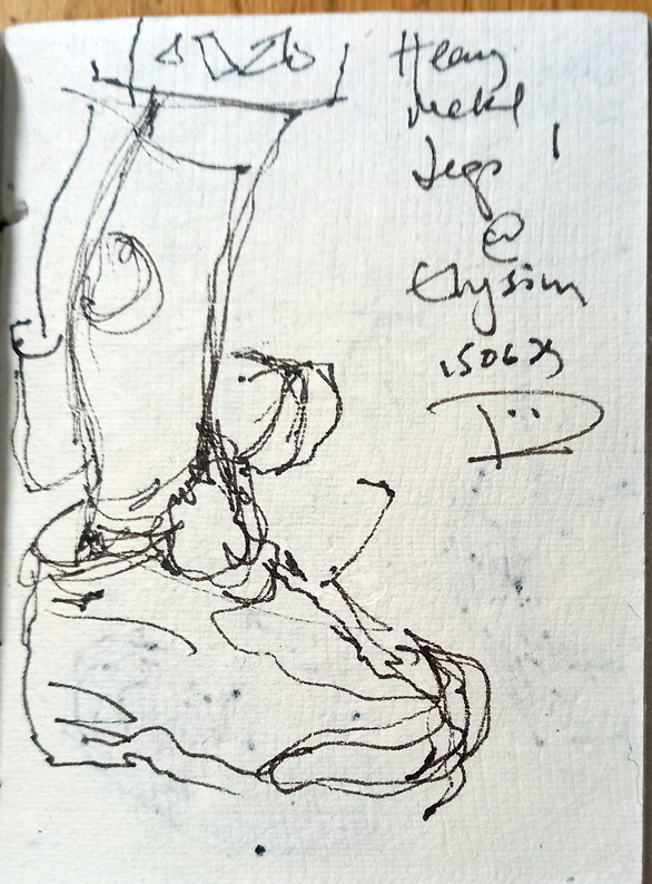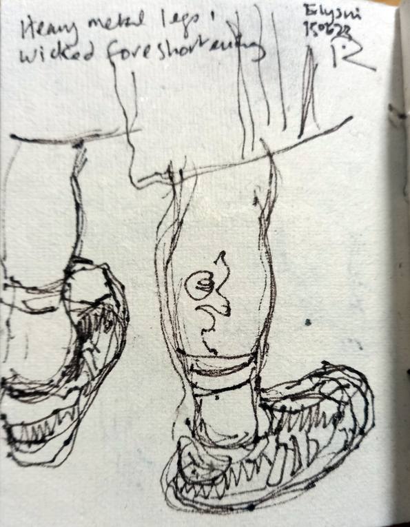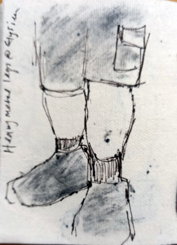 Husb and I went to a gig at Elysium on Samhain a few days ago, a mixture of performers, folk and metal, with a pagan theme. When I go to gigs, I often draw legs in the audience and I did at this one. Then it occurred to me that everyone was wearing long trousers. When I go to metal and rock gigs, the majority of the audience, well men, wear short trousers – like the drawings I did below during Swansea Fringe last year.