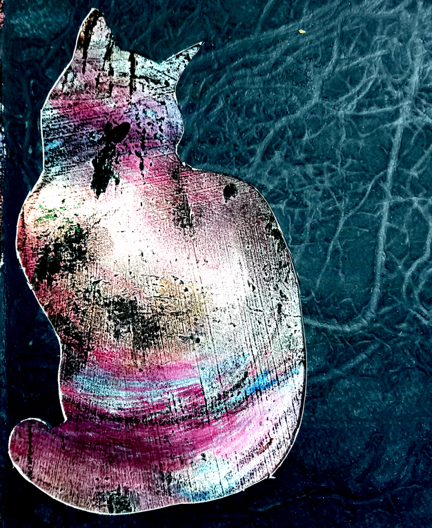 I’m clearing out my plans chests. I have two and I want to cut back to one. That’s a lot of sorting to do. As I’m going along I’m finding lots of nice papers that I’ve coloured up for one reason or another, so I’m having a bit of #Caturday fun with some cat silhouettes I cut out a while back, putting them onto different backgrounds. Art doesn’t have to be serious all the time. The silhouette shows our little elderly rescue cat, William ChatNoir, aka Bill.