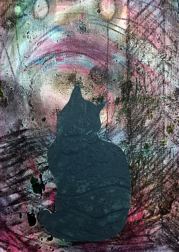 I’m clearing out my plans chests. I have two and I want to cut back to one. That’s a lot of sorting to do. As I’m going along I’m finding lots of nice papers that I’ve coloured up for one reason or another, so I’m having a bit of #Caturday fun with some cat silhouettes I cut out a while back, putting them onto different backgrounds. Art doesn’t have to be serious all the time. The silhouette shows our little elderly rescue cat, William ChatNoir, aka Bill. The background is some paper I experimented with, using textured gesso, acrylic paint washes and compressed charcoal.