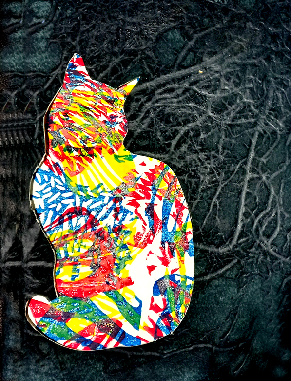 As I’m clearing out my plans chests I’m finding lots of nice papers that I’ve coloured up for one reason or another, so I’m having a bit of #Caturday fun with them. This background is made up of lots of small random shapes I cut into acrylic blocks (a cheap alternative to lino) and I printed and overprinted them with translucent Cranfield Safewash relief inks in the 3 primary colours. I wasn’t too keen on the results back then but it’s always a good idea to keep hold of things because you never know when they might come in useful.