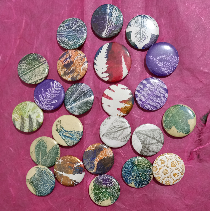 I’ve been doing a lot of teaching and demonstrations recently and I’ve collected lots of Gelli Plate prints using leaves, and some graphite rubbings as well. I’ve an art and craft fair coming up on December 7th and I thought I’d use the gel prints to make unique and original badges