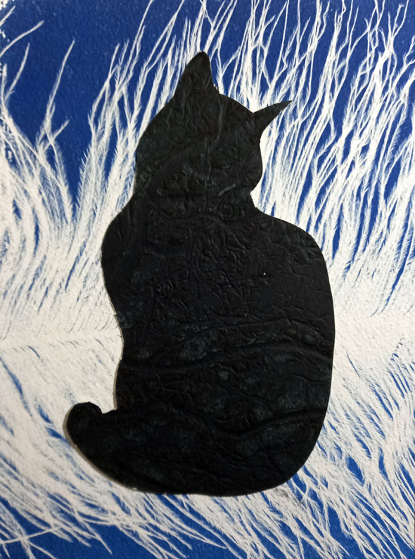 This #Caturday Saturday, my silhouette of our little Bill is on top of a cyanotype print that someone threw away, I fished it out of the paper bin! I think she looks lovely silhouetted against the ostrich feather. The image of Bill is cut out of some discarded paper too. I painted it black.