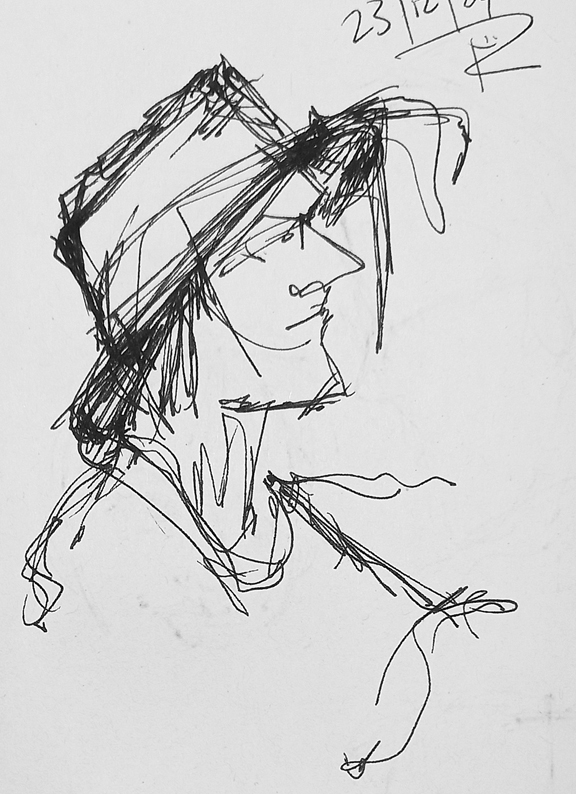 I haven’t posted for a couple of days because I went and did my back in on New Year’s Eve. OUCH! I’ve never had back pain before, what a shocker! It really stopped me in my tracks for 48 hours and it’s still a bit grinchy. Is that a technical term? 😀 That’s what it feels like now. Anyway, here’s the last sketch I did at The Westbourne just before Christmas, a musical fundraiser for a children’s cancer charity. It’s hard drawing hats on heads, separately they’re fine but together they’re difficult.