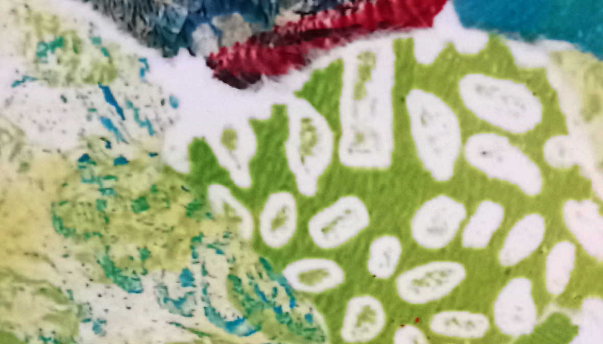 Over the past few months I’ve been working with a group of adult students to develop an exhibition for The Senedd, the Welsh Government building in Cardiff. I took the lead on creating a giant display of collages that are exhibited on 4 enormous panels, about 4 metres high. Each of these panels was originally made on A3 size paper, using fragments of gel-plate prints, ripped up and reassembled in the collages. These were then scanned and enlarged to about 4 x 2.5 metres and printed onto plastic for display. I’m loving the results, the enlargement shows textures and patterns that would not be noticed on the original tiny scale.